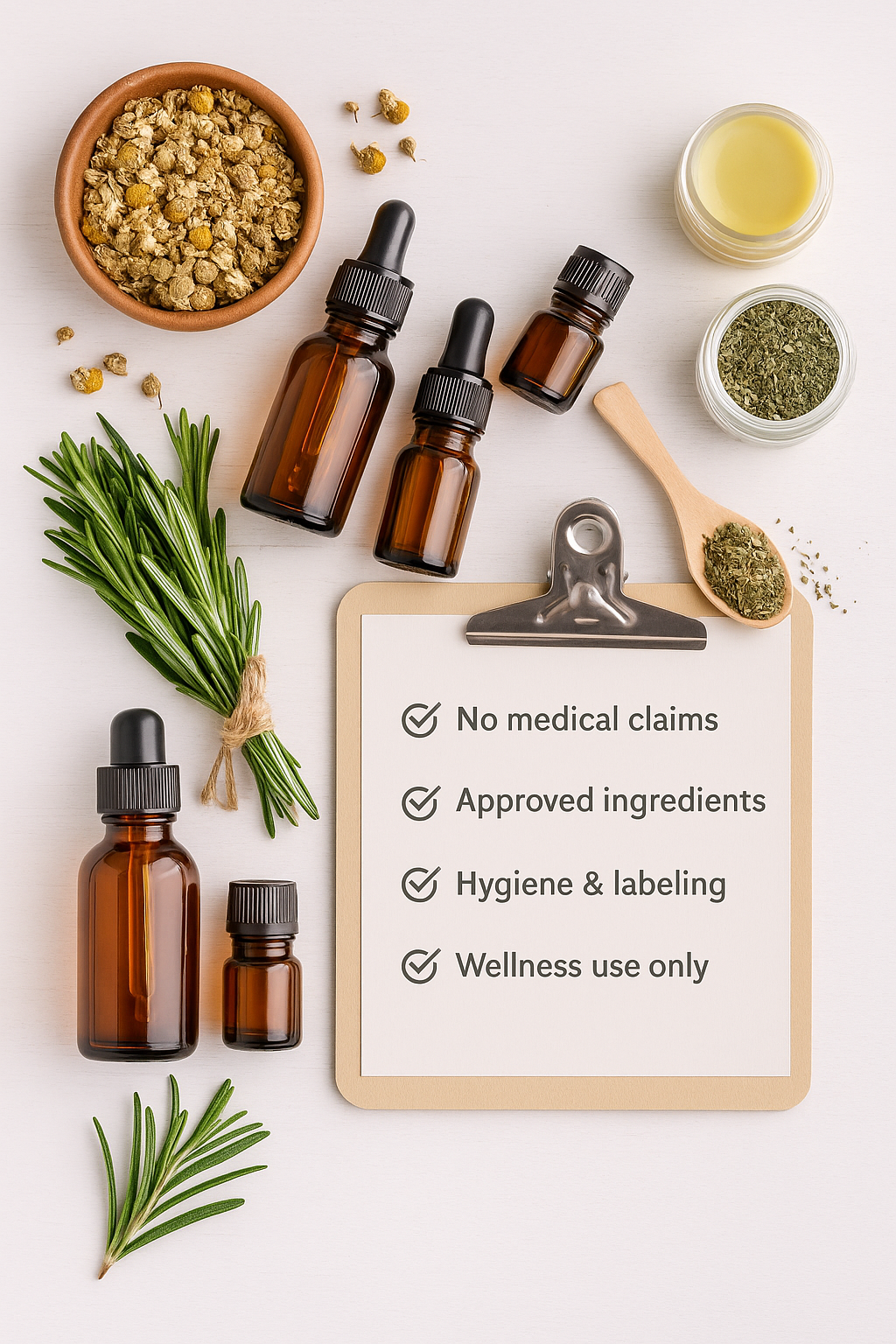 2. Approved ingredients only — use herbs, oils, and tinctures that are legally allowed and safe, without prescription-based or toxic substances.
