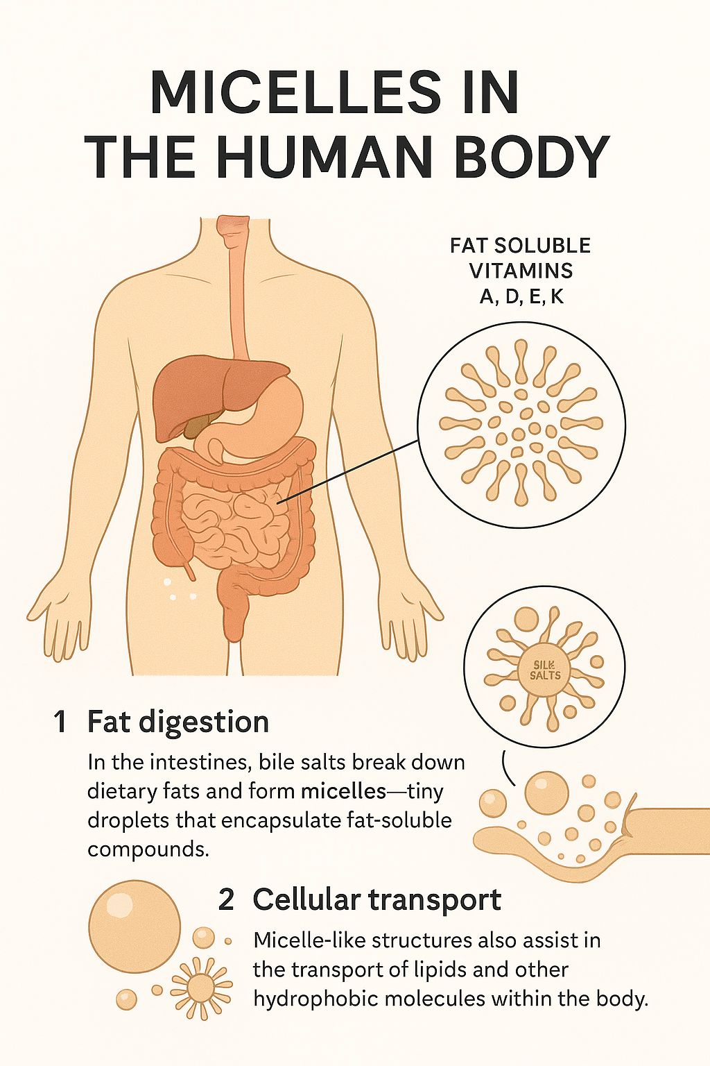 Micelles are a natural delivery system the body uses to dissolve and transport fat-soluble substances in water-based environments like the gut and bloodstream. Modern pharmaceuticals and nutraceuticals enhance and replicate this mechanism to increase the bioavailability of active compounds.